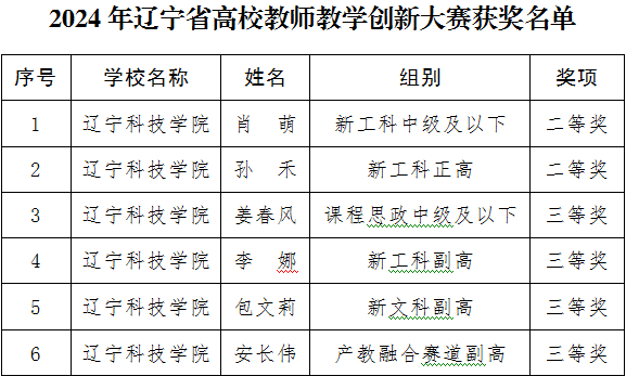 近日,辽宁省教育厅公布了2024年辽宁省教师教学创新大赛获奖名单,我校教师团队喜获佳绩,机械工程学院肖萌、电气与自动化工程学院孙禾等2位教师(团队)荣获二等奖,生物医药与化学工程学院姜春风、资源与土木工程学院李娜、经济与管理学院包文莉、生物医药与化学工程学院安长伟等4位教师(团队)荣获三等奖。