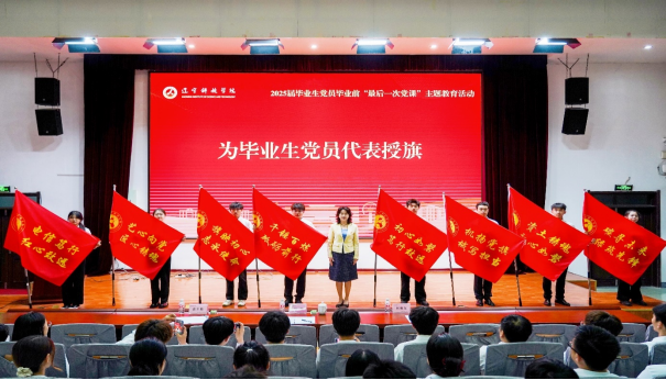 钢铁淬火・铸魂育人:一盏“领航灯”照亮信仰之路。党委书记赵毅以《坚守初心、慎终如始,在强国建设的征程中淬炼“钢”与“铁”的青春》为题,为毕业生党员讲授了离校前的“最后一堂党课”,将“东北抗联精神+钢铁文化”的坚韧品格融入强国建设的伟大征程,引导学生心怀“国之大者”。庄严的授旗与赠书仪式,象征着红色基因与辽科精神的薪火相传,完成了深刻的思想淬炼。