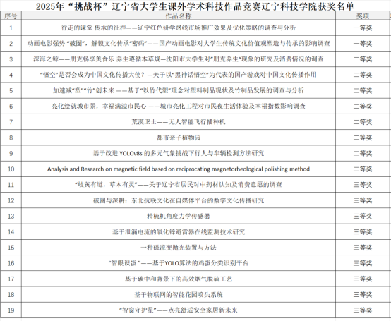 2025年“挑战杯”辽宁省大学生课外学术科技作品竞赛于辽宁石油化工大学举行,历时近三个月,经过校赛和省级初赛、决赛的层层选拔,于8月27日公布比赛结果,我校在本届竞赛中获得省赛一等奖2项、二等奖8项、三等奖9项。