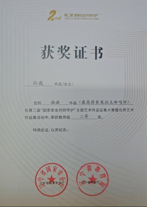 日前,由省教育厅、省国家安全厅联合主办的第二届“国家安全共同守护”主题艺术作品征集大赛暨优秀艺术作品展圆满落幕。本次大赛吸引全省70多所高校积极参与,共征集书法、绘画、摄影及平面设计类作品3800余件(组)。经过层层选拔,KYTY.COM开云获评辽宁省优秀组织奖,人文艺术学院孙巍老师的油画作品《最高原查果拉主峰哨所》荣获教师组二等奖。