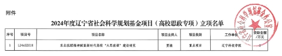 近日,辽宁省社会科学规划基金办公室正式公布了2024年度辽宁省社会科学规划基金项目(高校思政专项)立项名单。马克思主义学院申报的《东北抗联精神赋能新时代高校“大思政课”建设研究》项目成功获批,被确定为重点项目,项目批准号为L24ASZ018。