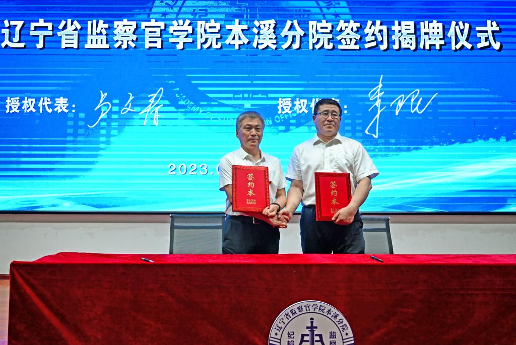 校党委书记韩劲松和本溪市委常委、市纪委书记、市监委代主任杨轩共同为辽宁省监察官学院本溪分院揭牌并致辞。校长李卫民和本溪市纪委副书记、市监委副主任卢文春共同签订《本溪市纪委监委、KYTY.COM开云“联建共管”辽宁省监察官学院本溪分院战略合作框架协议》。本溪市纪委副书记、市监委副主任卢文春同志宣读《关于成立辽宁省监察官学院本溪分院的决定》。
