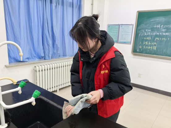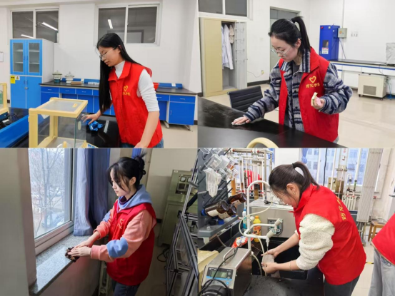 活动期间,志愿者们身着统一服装,以饱满的热情和高度的责任感投入实验室清洁与维护工作。他们认真清理实验废弃物,细致擦拭每台仪器设备,确保其干净整洁并摆放有序。同时,志愿者们对实验室进行了全面彻底的清洁,包括地面、墙面以及各类卫生死角,使整个实验室环境焕然一新。志愿者们的行动和努力不仅使实验室变得整洁美观,更是展现了新时代青年的责任感和使命感。