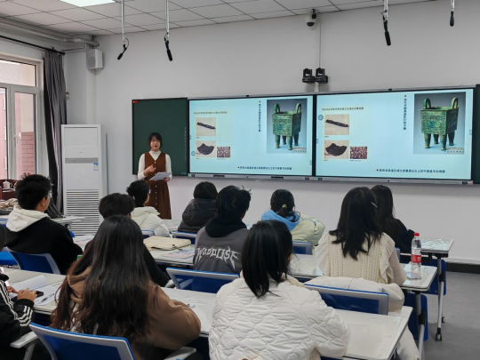 授课过程中,黄可宁以丰富的文物与史料为线索,从六千年前姜寨遗址的青铜器讲起,回溯至战国时期领先西方近两千年的生铁冶铸技术,生动展现了中国古代冶铁业的辉煌成就。聚焦本溪地区,她详细介绍了太子河流域蕴藏的30亿吨铁矿与301亿吨煤田所形成的“煤铁共生”资源情况,并结合战国铁钁、汉代铁甲片、明代威宁营铁场等实物与文献记载,清晰勾勒出本溪作为东北地区煤铁工业中心的历史发展脉络。在近现代篇章中,她讲述了1927年“八二三大罢工”中工人们的英勇抗争、1948年五万工人奋战36天修复高炉的动人场景,以及1949年本钢生铁产量占全国六分之一、1号高炉创下“三十连冠”等辉煌业绩,使学子们深切感受到一代代工业建设者的使命与担当。