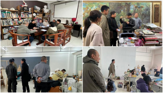 在沈阳大学,一行与美术学院绘画系主任刘海洋教授、著名画家李蒸蒸教授等进行座谈。刘海洋分享了综合类大学应用型绘画人才培养经验,以沈阳大学美术学院绘画专业人才培养方案为实例,详细介绍了课程设置、实践教学环节、毕业论文(创作)、课程思政建设、国际化合作模式、教师创作与学术交流机制、学生大创项目与竞赛培育、美育改革实践、教师职称评定与教学科研激励机制、校友资源对接与传承体系等方面的特色成果。李蒸蒸结合自身创作实践,分享了多年教学与创作经验,他强调了中国画课堂中教师范画的重要性,提出“笔墨随时代”的创作理念,倡导在坚守传统的基础上开展中国画创新实践。随后,双方围绕专业评估标准、工作室教学模式、学生就业服务体系等议题展开深入研讨,并实地参观了沈阳大学油画、中国画、城市景观绘画等专业教室,以及教师工作室、校内美术馆等教学与创作场地。