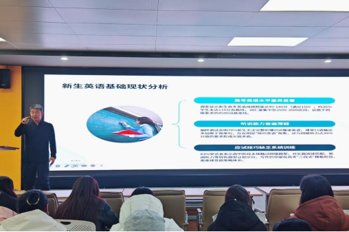培训现场,崔巍紧扣备考实际需求,对四级考试核心考情展开全面拆解。随后聚焦写作、听力、阅读、翻译四大题型,从分值占比、难易梯度,到考试时间分配技巧与答题规范等方面逐一细致讲解,助力学生搭建清晰备考框架,明确各阶段复习重心。结合新生英语基础现状调查数据,崔巍点明新生普遍存在的薄弱点,并详解了考试时间分配、题型分值及各模块考核重点,让新生对英语四级考试结构形成系统且深刻的认知。