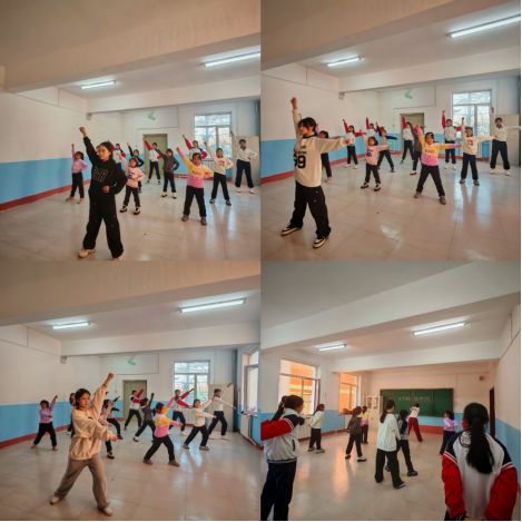 啦啦操课程教学以“夯实基础,突破技能,凝聚团队”为核心目标,展开了系统而富有成效的训练。在教学过程中巧妙地将趣味化元素与专业化要求相结合,设计了形式多样、互动性强的教学环节。不仅注重学生个体在柔韧性、协调性、节奏感等啦啦操基本动作上的规范与熟练,更着力引导他们在难度动作上寻求突破,挑战自我。同时,课程特别强调团队协作精神的培养,通过队列变换、组合造型、默契配合等方式练习,有效提升了学生的集体荣誉感和团队凝聚力。在舞台表现力方面,通过表情管理、动作张力诠释等细节指导,帮助学生更好地理解并展现啦啦操的运动之美与艺术感染力,使他们在挥洒汗水的过程中,不仅强健了体魄,更收获了自信与快乐。